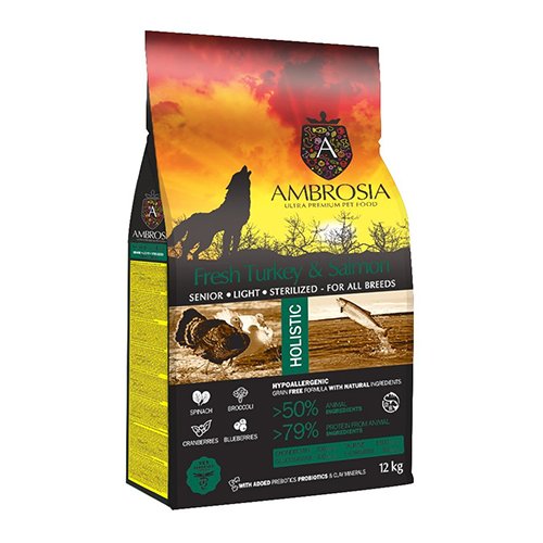 Nuestra receta de AMBROSIA Fresh Turkey & Salmon está especialmente formulada para perros mayores, obesos y esterilizados que mantienen altas cantidades de proteínas provenientes del pavo fresco y el salmón con niveles optimizados de grasa y son ricas en Omega 3 y Omega 6.La receta de Ambrosia Fresh Turkey & Salmon proporciona una dieta equilibrada baja en calorías que también incluye prebióticos y probióticos para mejorar la digestión y el sistema inmunológico, condroitina y glucosamina para proteger las articulaciones, taurina y L-carnitina para ayudar al sistema cardiovascular y muscular y al metabolismo.